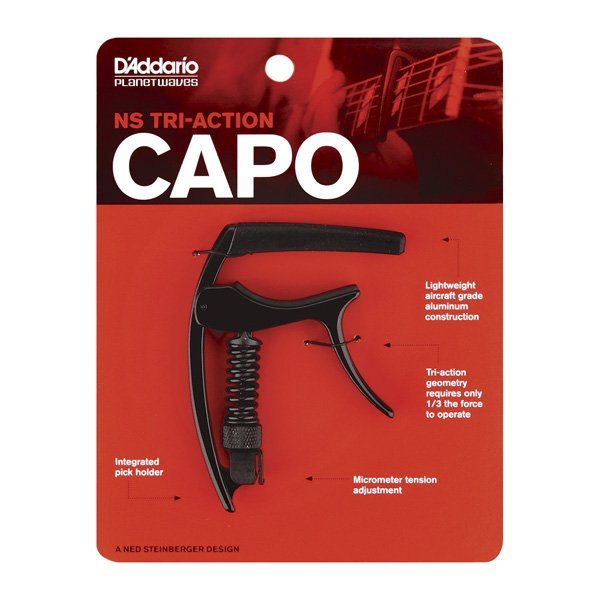 El capo Tri-Action garantiza un rendimiento sintonizado y sin zumbidos en cualquier traste. La geometría patentada Tri-Action reduce la fuerza requerida para abrir y cerrar el capo y aplica una tensión uniforme independientemente del perfil del cuello. Combinado con el ajuste de tensión del micrómetro y la presión horizontal directa, el Tri-Action Capo prácticamente elimina tirar de las cuerdas de lado a lado y la necesidad de volver a sintonizar durante el uso.