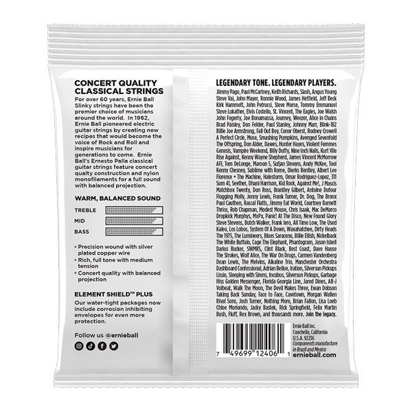 Las cuerdas de la guitarra de concierto de Ernesto Palla se fabrican a partir de un filamento sólido de nailon. Las cuerdas cuarta, quinta y sexta cuerda se fabrican con un alambre de cobre envuelto alrededor de un núcleo de seda de nailon que proporciona un tono rico y cálido. Todas las cuerdas de Ernie Ball están fabricadas con precisión, usando los más altos estándares y las especificaciones más exigentes para asegurar consistencia, rendimiento óptimo y larga vida útil. Calibres. Primera .028, Segunda .032, Tercera .040, Cuarta .030, Quinta .036, Sexta .042. Tensión media.