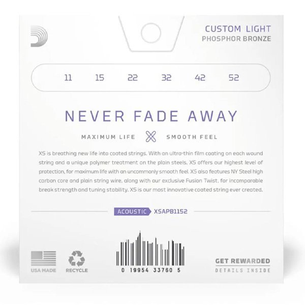 Fabricadas con un núcleo de NY Steel, alambre de envoltura de bronce fosforoso y tecnología Fusion Twist, las cuerdas de guitarra acústica recubiertas XS tienen una resistencia a la rotura y una estabilidad de afinación incomparables, además de una vida útil dramáticamente mayor. Este conjunto de calibre Custom Light 11-52 tiene un poco más de volumen y proyección que Extra Light, sin dejar de ser fácil de tocar.