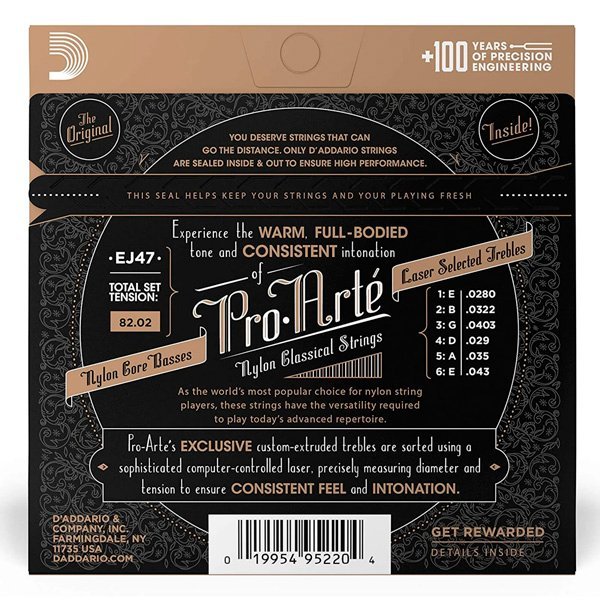 - EJ47, tensión normal, cuenta con bajos de bronce 80/20 para un tono acústico brillante, sensación cómoda y proyección dinámica. Todas las cuerdas de agudos Pro-Arté están controladas por computadora mediante un microscopio láser X-Y que realiza mediciones de diámetro y tensión, asegurando agudos precisos y de verdadero sonido en cada conjunto. Los bajos Pro-Arté se enrollan con cobre plateado en un núcleo de nylon de múltiples filamentos para un tono consistente y cálido, pero proyectante.