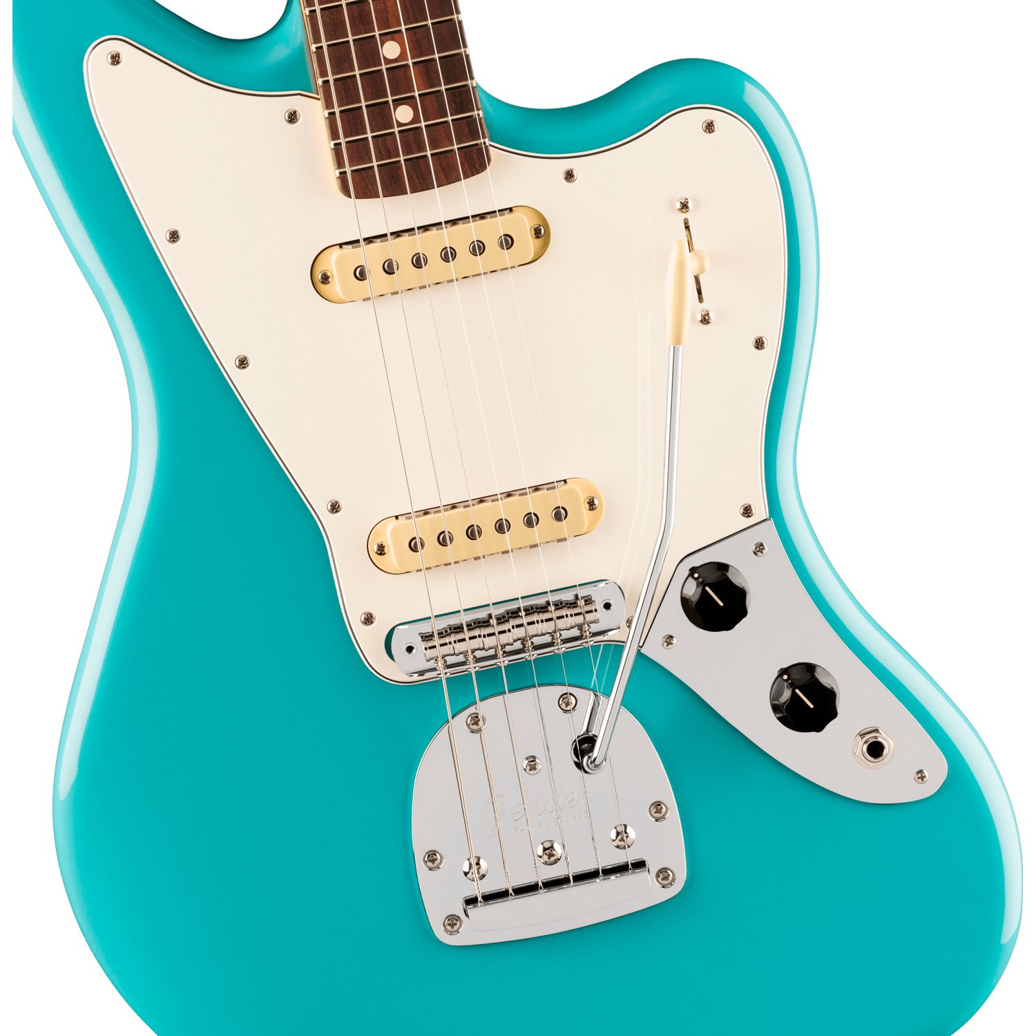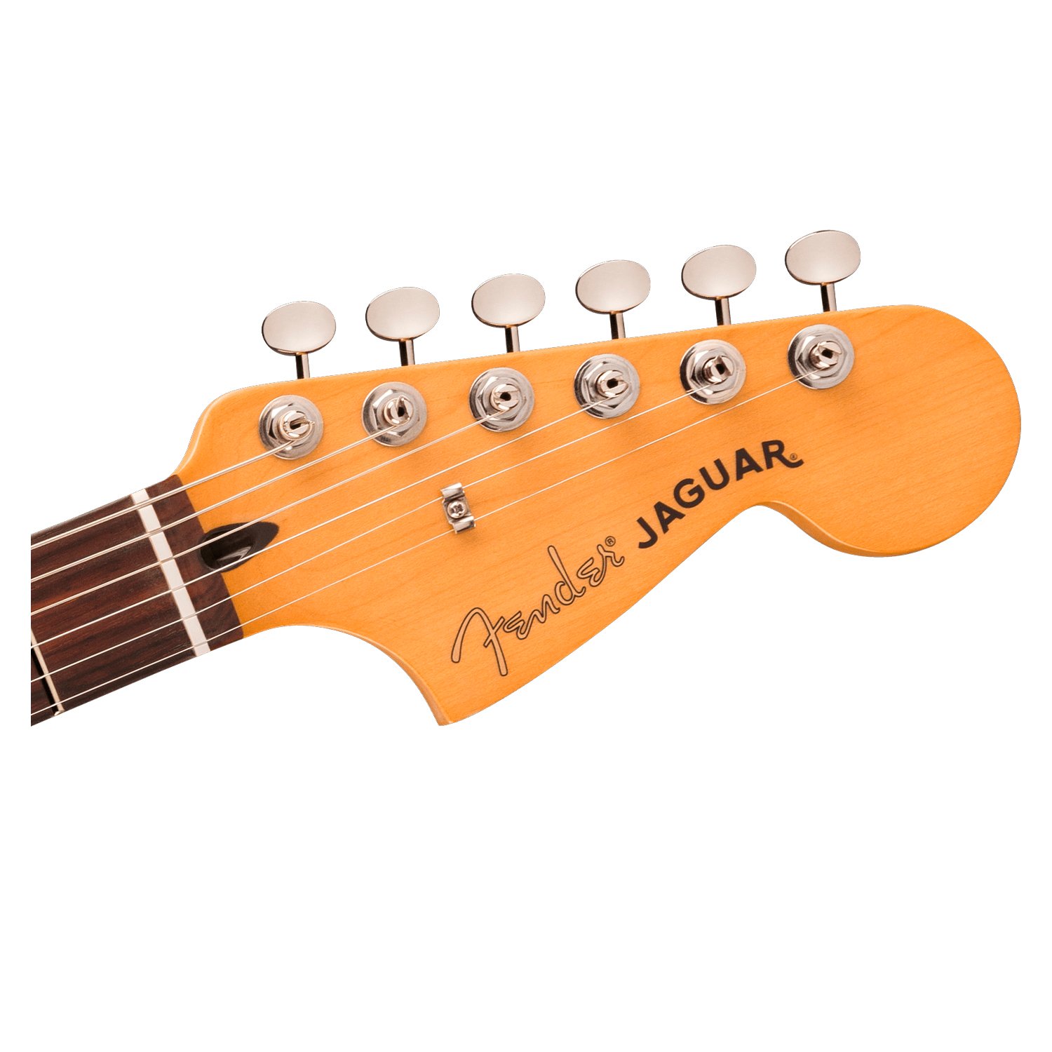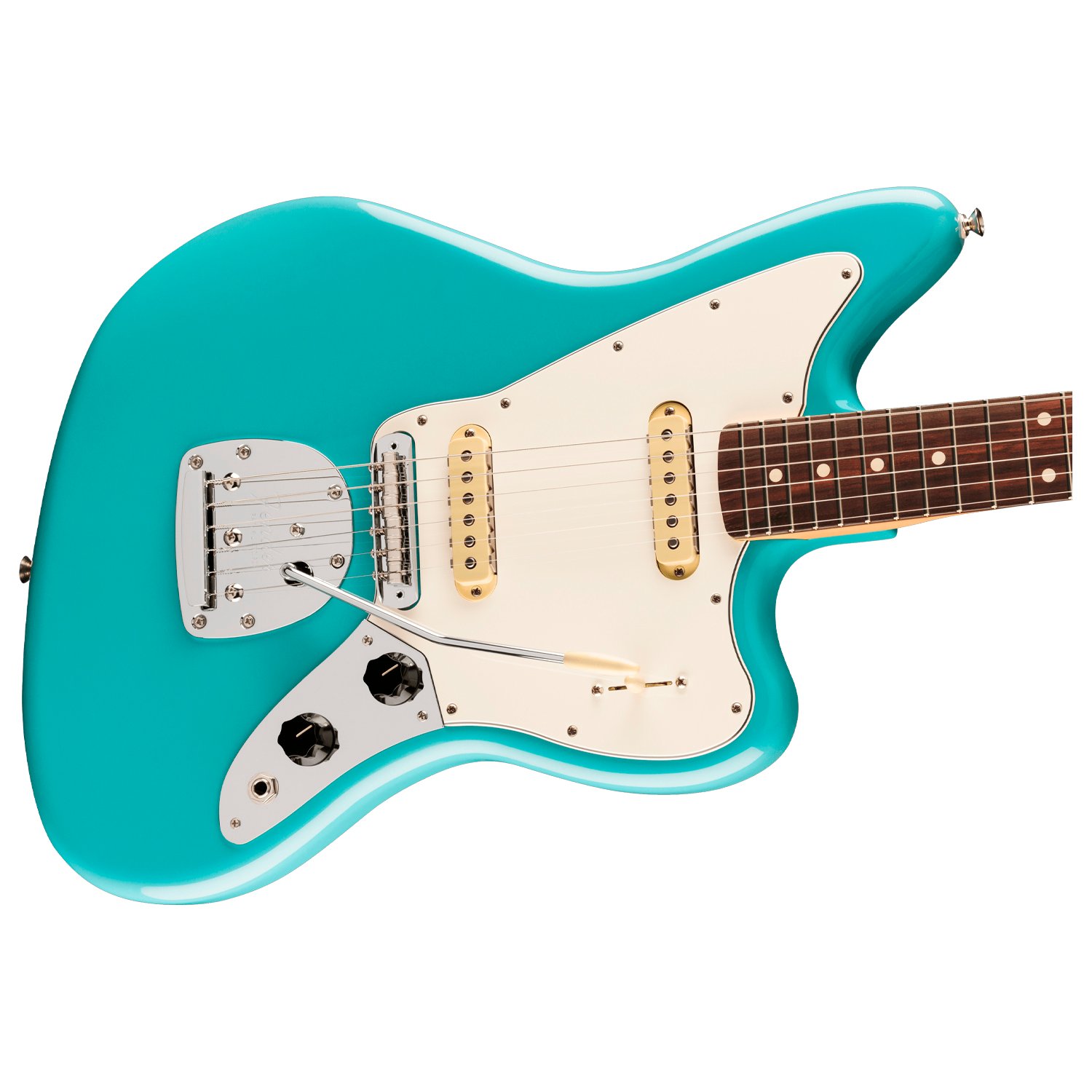 El Player II Jaguar irradia el encanto eterno de Fender, pero debajo del capó, está preparado para los músicos de hoy. Todo en el mástil está diseñado para una ejecución rápida y fluida, desde el moderno perfil en «C» con un sedoso acabado de uretano satinado en la parte posterior hasta el cómodo palosanto de 9.5″ de radio con bordes lisos y 22 trastes medium jumbo. Un cuerpo clásico de aliso está disponible tanto en acabados Fender atemporales como en colores nunca antes vistos rescatados de los archivos. Las pastillas Jaguar de bobina simple Player Series Alnico V (puente) y Alnico II (mástil) ofrecen agudos cristalinos, medios musicales y graves ajustados que elevan cualquier género. El selector de cuchillas de 3 posiciones te permite ajustar fácilmente todo, desde el timbre cristalino de la pastilla del mástil hasta la mordida cortante de la pastilla del puente y todos los puntos intermedios, mientras que un puente Jaguar de 6 selletas con trémolo flotante, selletas Mustang® mejoradas y afinadores ClassicGear™ garantizan una estabilidad de afinación precisa para la flexibilidad de explorar infinitas posibilidades sonoras.