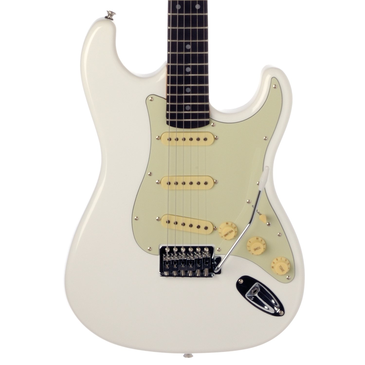 La S-300V Olympic White es la guitarra eléctrica de la serie «Tribute Vintage» de Eko Guitars, inspirada en los famosos modelos Stratocaster, en color Olympic White. Cuenta con cuerpo de álamo, mástil de arce y diapasón de resina Eko WPC (compuesto de polímeros de madera), con acabado brillante tanto en el cuerpo como en el mástil. Incorpora tres pastillas de bobina simple, controles de volumen y dos tonos, y un selector de 5 posiciones. Este instrumento está diseñado para ofrecer un sonido y una estética vintage a un precio asequible.