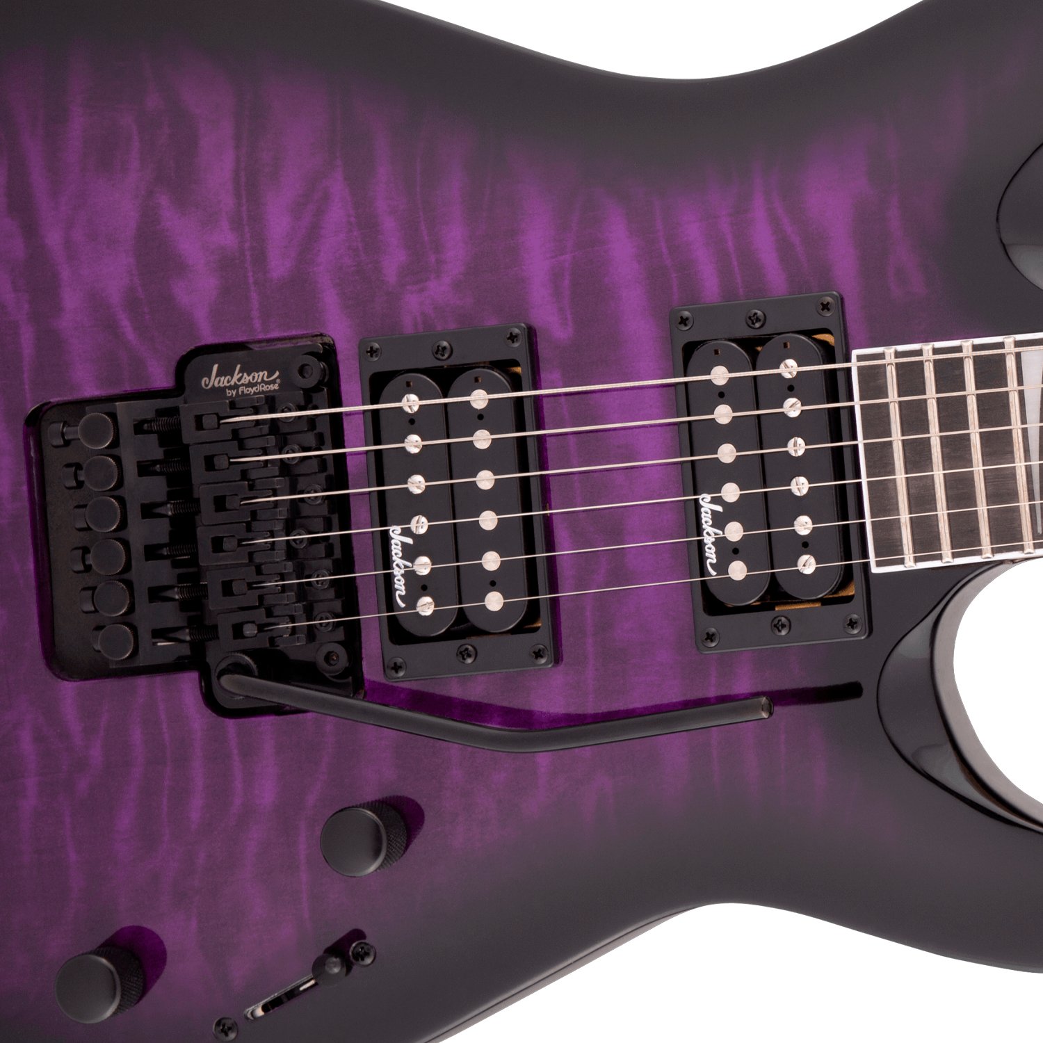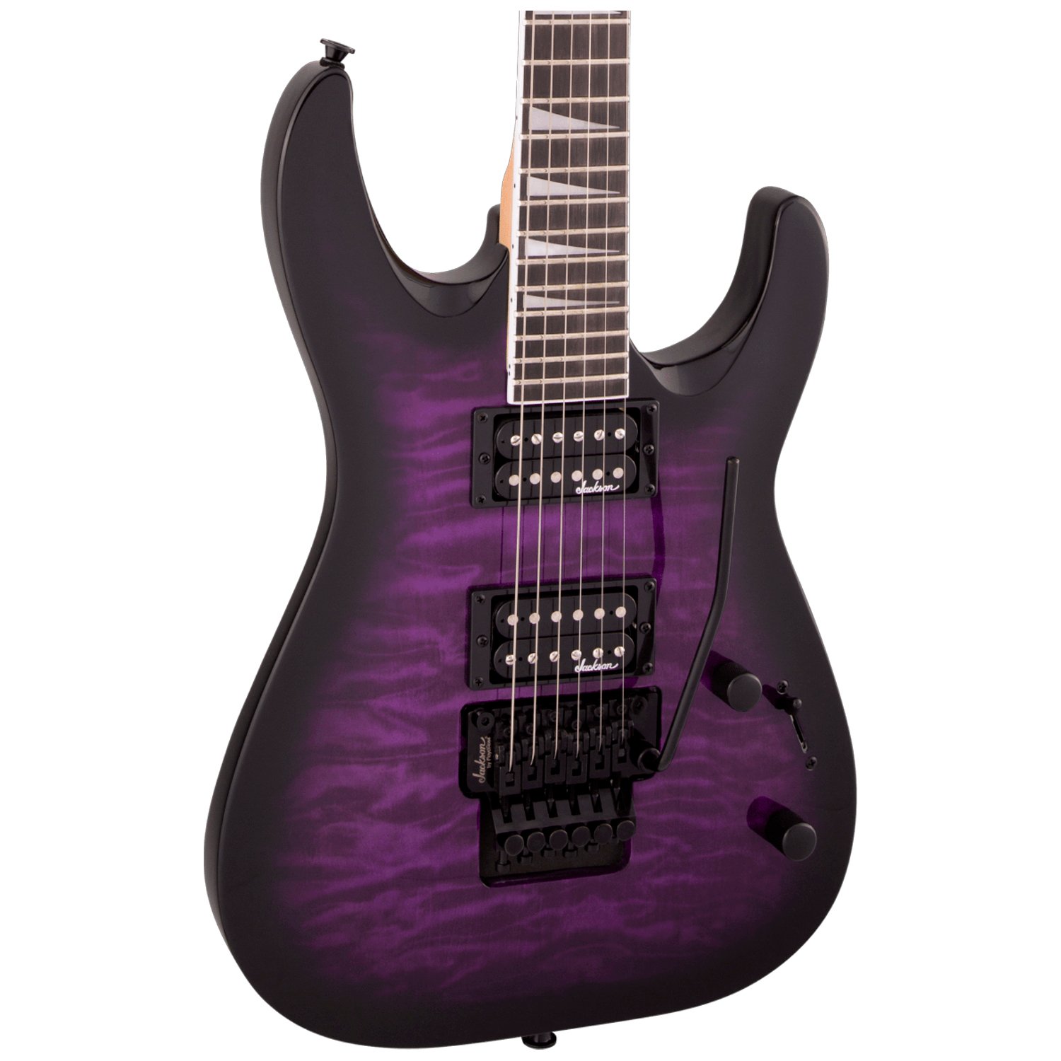 Equipada con pastillas humbucker duales Jackson de alta potencia de montaje directo con imanes de cerámica, la JS32Q DKA también cuenta con un selector de tres posiciones, controles de volumen y tono individuales, puente de trémolo de doble bloqueo Floyd Rose® con licencia de la marca Jackson, botones de correa estándar y clavijeros sellados de fundición a presión.