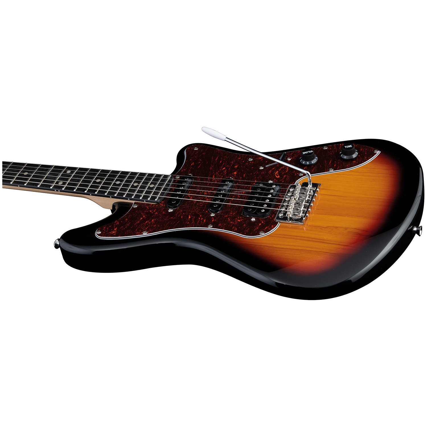 La Camaro VR HSS VINTAGE BURST es un homenaje a la famosa guitarra eléctrica de los años 70 de Eko Guitars. Está fabricada con cuerpo de álamo, mástil de arce y diapasón de resina Eko WPC (compuesto de polímeros de madera). Cuenta con dos pastillas single-coil (mástil y central) + una humbucker de puente Wilkinson, selector de 5 posiciones, controles de volumen y tono, pulsar/pulsar para dividir la humbucker, puente Eko con palanca de trémolo y clavijero Die-Cast. Ideal para el guitarrista amante del estilo vintage de los 70.