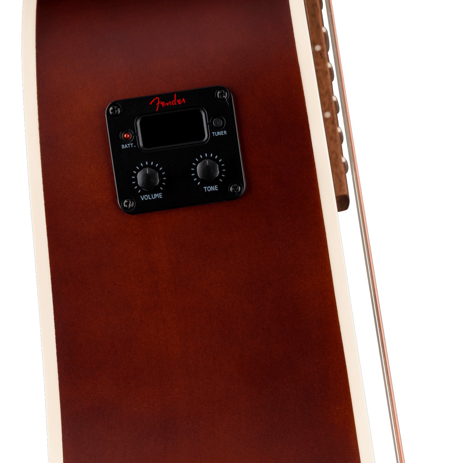 La California Debut™ Redondo® CE presenta una construcción laminada resistente con tapa de abeto y fondo y aros de sapeli para un sonido satisfactorio, mientras que un mástil de escala de 25 ½» con un perfil delgado en forma de «C» proporciona una sensación de ejecución fluida. La electrónica Fender integrada proporciona una salida de alta calidad para amplificación en vivo, grabación y efectos, además de un práctico afinador digital integrado. Otros detalles notables incluyen un diapasón y puente de nogal aceitado, clavijeros de engranajes sellados para una afinación suave y precisa, y un acabado satinado de alta calidad.