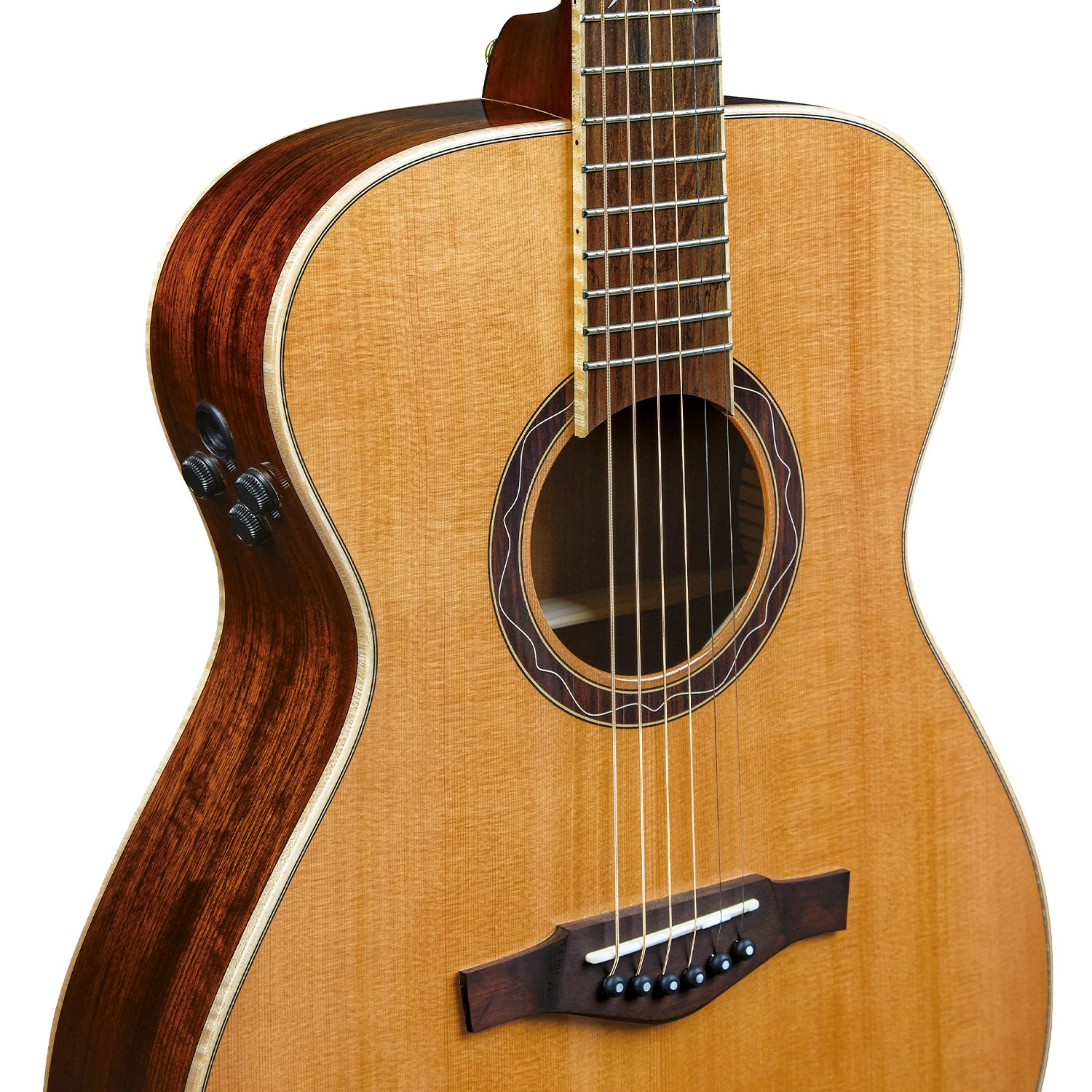 La MIA A400e viene en color natural con acabado brillante y forma de auditorio. La combinación de una tapa de cedro macizo con aros y fondo de ovangkol, resultado de una cuidadosa investigación, le da a este instrumento un espectro tonal amplio y siempre bien equilibrado en cada cuerda. Una característica destacable es la presencia del Fishman Flex Blend: un sistema de amplificación de alto rendimiento que consta de un piezoeléctrico y un micrófono de condensador interno, que permite capturar cada matiz de la guitarra gracias a la posibilidad de agregar gradualmente la señal del micrófono a la señal piezoeléctrica mediante un potenciómetro Blend. Además del volumen de salida y el control Blend, la MIA A400e cuenta con un afinador con pantalla (que se puede activar presionando el potenciómetro de volumen) y un control de ecualización que funciona en modo «mid-cooped»: ajústelo al mínimo para una señal plana, luego auméntelo para reducir gradualmente las frecuencias medias en favor de los graves y agudos, muy conveniente para lograr un sonido listo para la mezcla. En caso de retroalimentación, algo bastante común durante las actuaciones acústicas, puedes invertir la fase pulsando el potenciómetro de ecualización. Todas estas características hacen del MIA A400e un instrumento idóneo para entornos profesionales, tanto en el estudio de grabación como en el escenario.