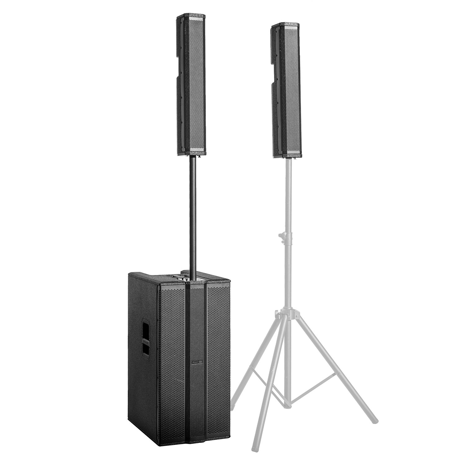 Con dos altavoces pasivos superiores y un subwoofer activo, es ideal para una amplia variedad de aplicaciones, desde directos hasta sesiones de DJ, desde eventos corporativos hasta músicos. Puede utilizarse como sistema mono o como sistema estéreo puro con dos altavoces superiores y un subwoofer.