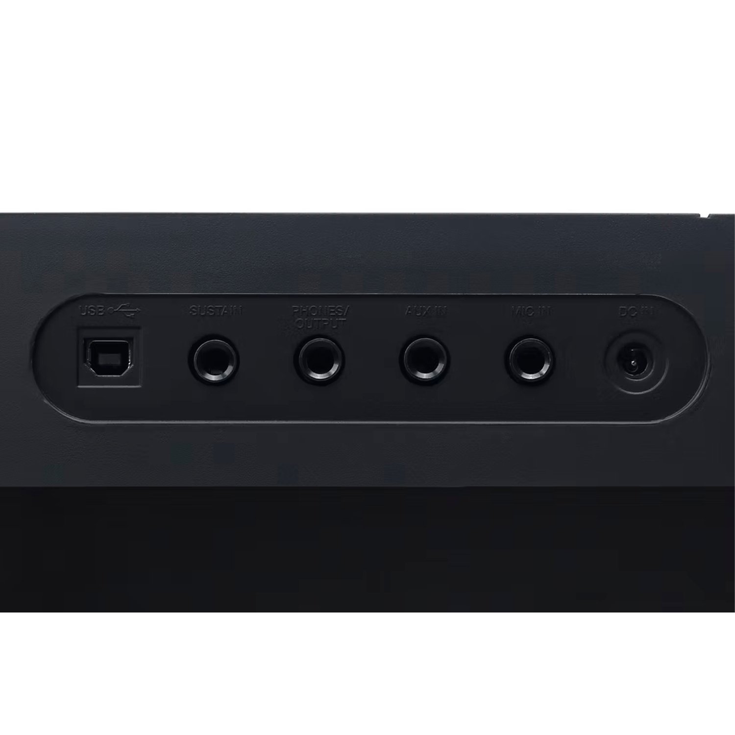 Conexión: USB-B (MIDI y audio), salida de auriculares (1 x 1/4″), entrada (1 x 1/4″), entrada de micrófono (1 x 1/4″), pedal (sustain)